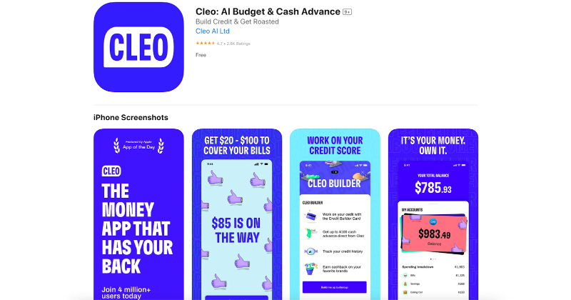 Cash Advance: Cleo gives you up to a $250 cash advance without interest, credit checks, or late fees.