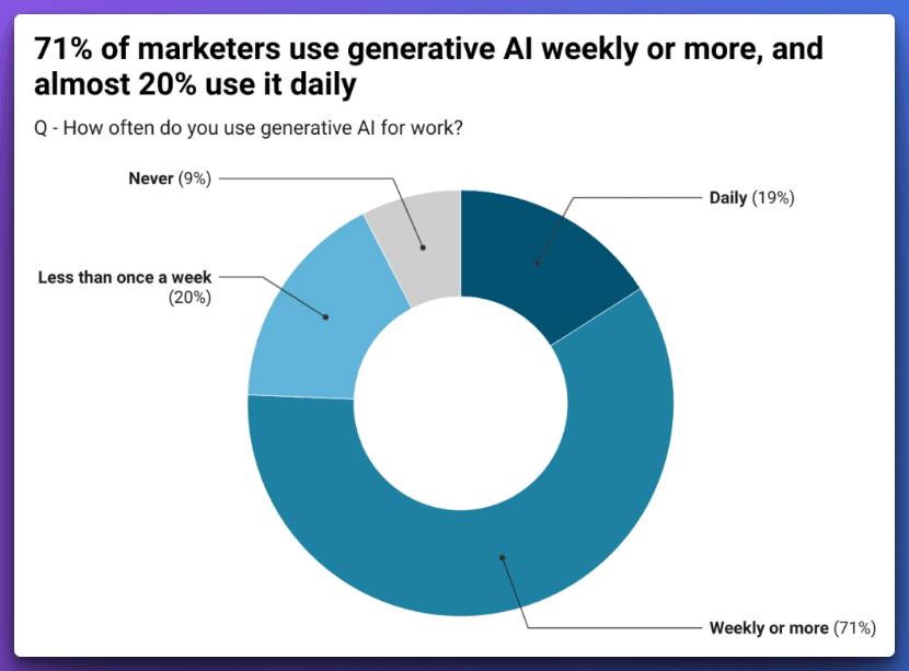 According to research by the American Marketing Association, nearly 90% of marketers are now using AI tools at work, with 71% using them weekly or more. This shows that AI has become a must-have part of marketing, not just something to try out.