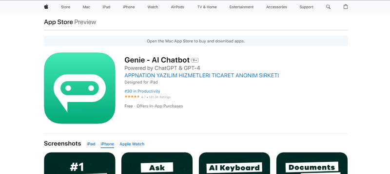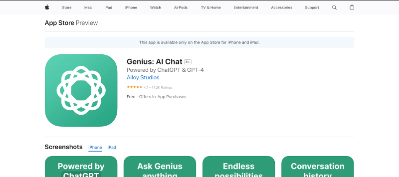 Genie - AI Chatbot is an intelligent iPhone buddy. This software, developed by AppNation, has over 10 million users and is noted for its straightforward design and authentic conversation experience. Genie is more than simply a chatbot; it's a versatile tool that can be utilized for various tasks. Genie can handle it all, whether you're looking for answers to your inquiries or recommendations or want a casual discussion.