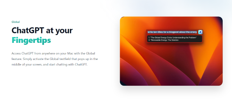 This convenient tool seamlessly operates within any macOS application, resembling the Spotlight feature, and is designed to intelligently adapt its performance based on the context in which it is invoked, thereby optimizing the quality of its generated content.