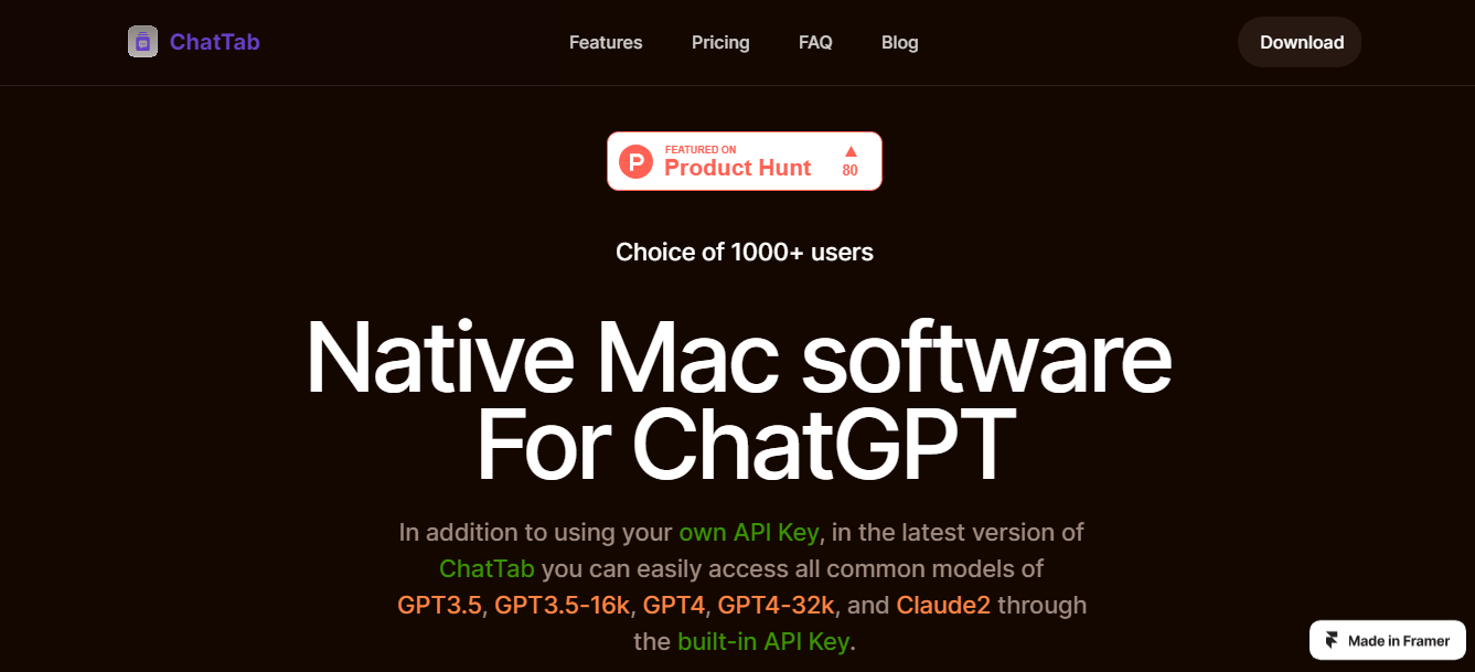 ChatTab's latest Mac software offers seamless integration with your personal API Key, allowing convenient access to a wide range of popular GPT models, including GPT3.5, GPT3.5-16k, GPT4, GPT4-32k, and Claude2, all within the application itself.