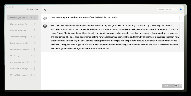 Just go to the “Elephas Super Chat” feature on your Mac, there you get the option to pick the brain you want to chat with, pick the one with your Obsidian Vault, and start chatting.