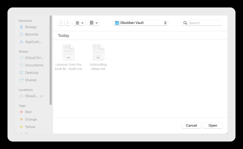 It will open up a file picker popup where you will be asked to pick the location of your Obsidian vault.