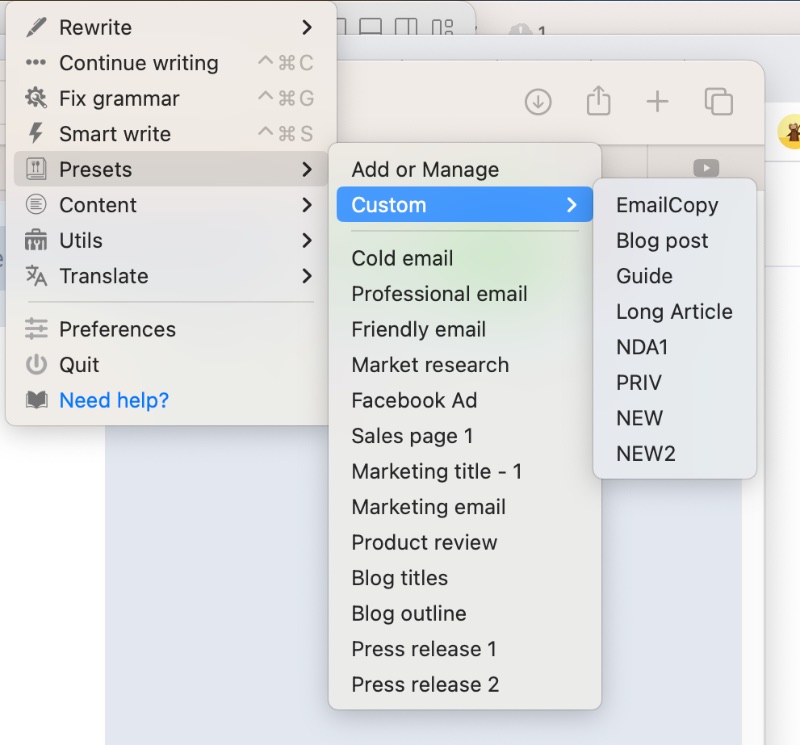 Writing can be a tedious task, especially when you have to write the same type of content over and over again. To help you with that, I have introduced presets with the 4.0 version. It has 12+ presets, which are ready-made templates for common writing such as market research, cold email, press release, product review, etc.