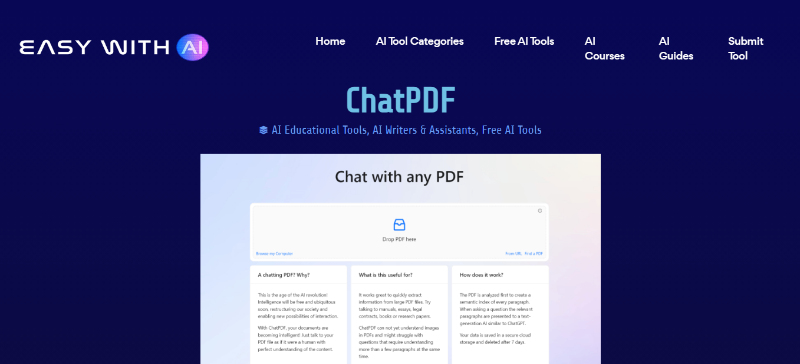 ChatPDF is a powerful chat with PDF AI tool for interacting with and extracting information from PDF documents. Creating a semantic index of each paragraph in the PDF, allows users to ask questions and receive answers based on the content of the document.