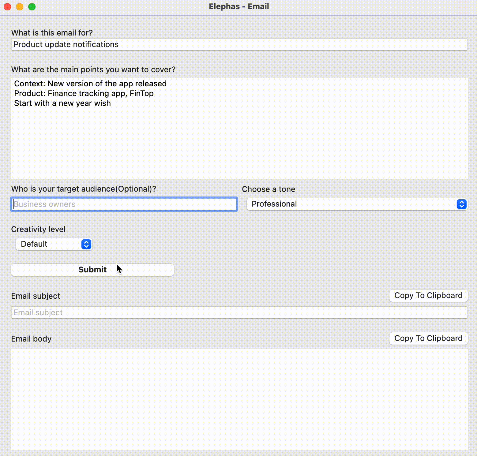 Elephas helps you write emails faster. Be it promotional emails, follow-ups, lifecycle emails, discounts, or cold outbound. You can do it in your favorite application, such as Gmail, Outlook, or Apple Mail. You need to use the "Smart write" feature to do it.