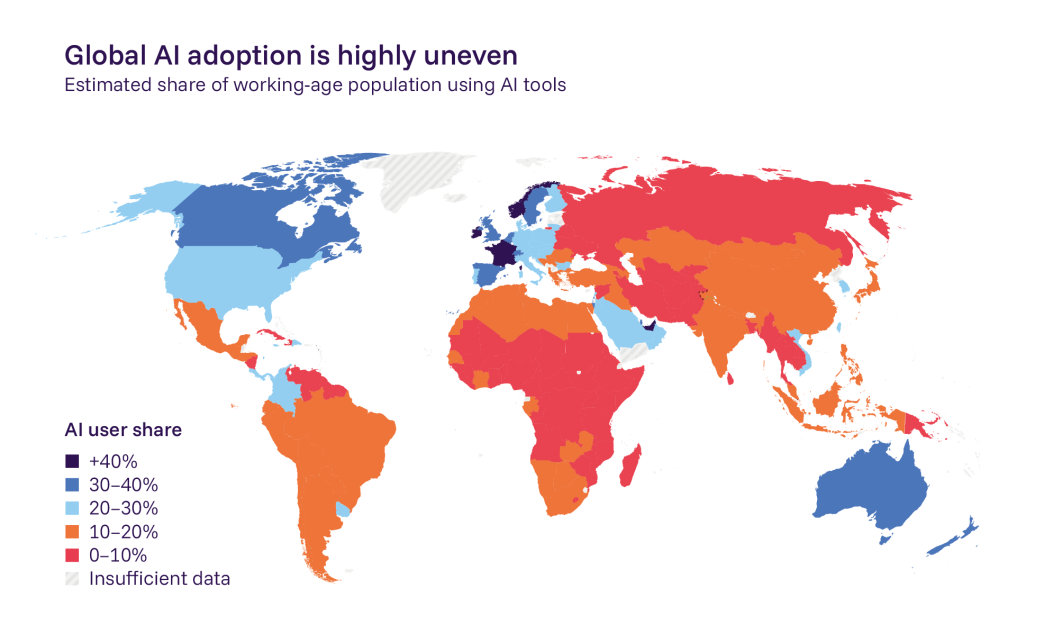 At least 700 million people use leading AI systems every week. In some countries like the UAE and Singapore, over 50% of the population uses AI tools. Across much of Africa, Asia, and Latin America, adoption rates remain below 10%.