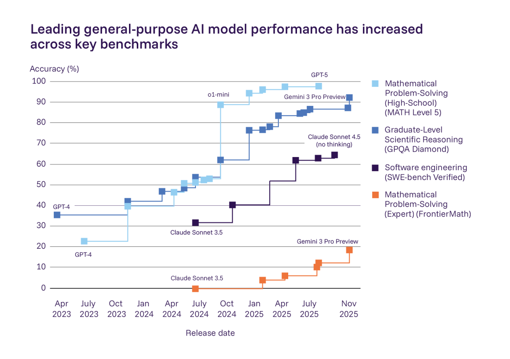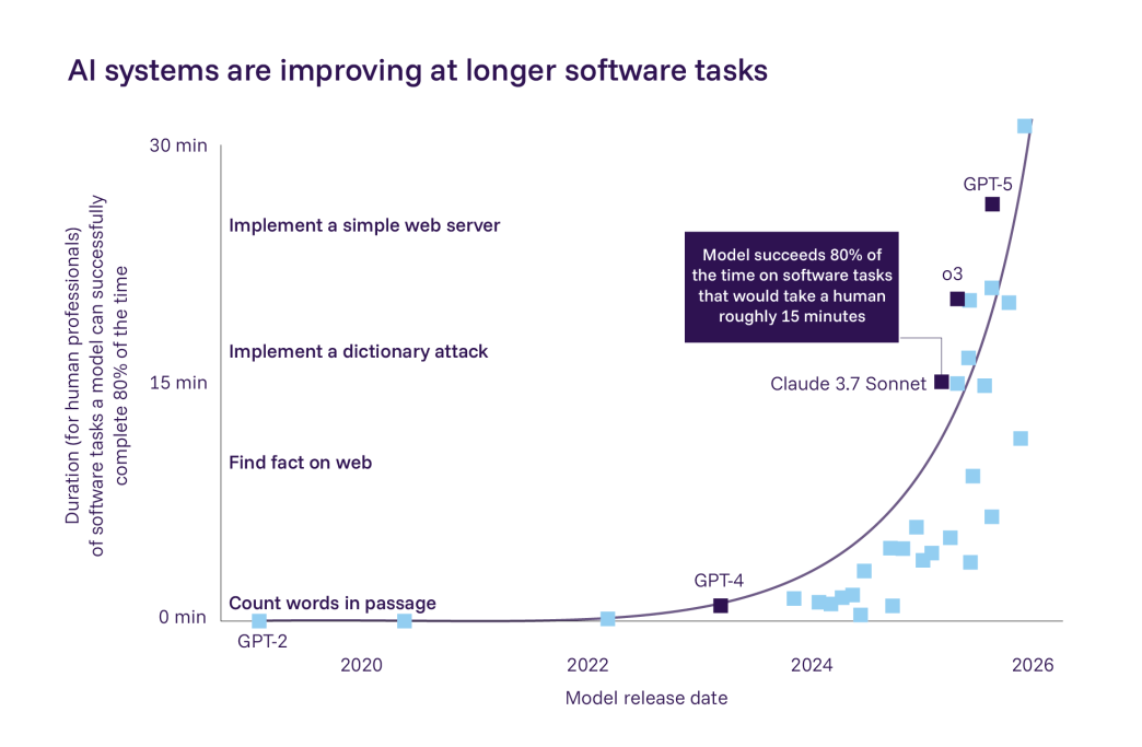 The first report came out in January 2025. A lot has changed in 12 months. AI systems got much better at math, coding, and working on their own. Leading models scored gold-medal level on International Mathematical Olympiad questions. AI agents can now finish coding jobs that would take a human about 30 minutes. Last year, they could only handle tasks that took around 10 minutes.