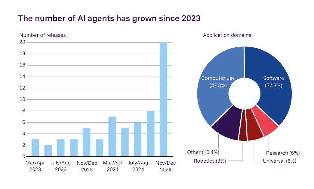 AI agents are autonomous systems that carry out tasks like browsing the web, writing code, or running experiments with little human oversight. They have become much more capable and widely available since last year. The number of deployed AI agents has grown significantly since 2023, with most used for software engineering and general computer tasks.