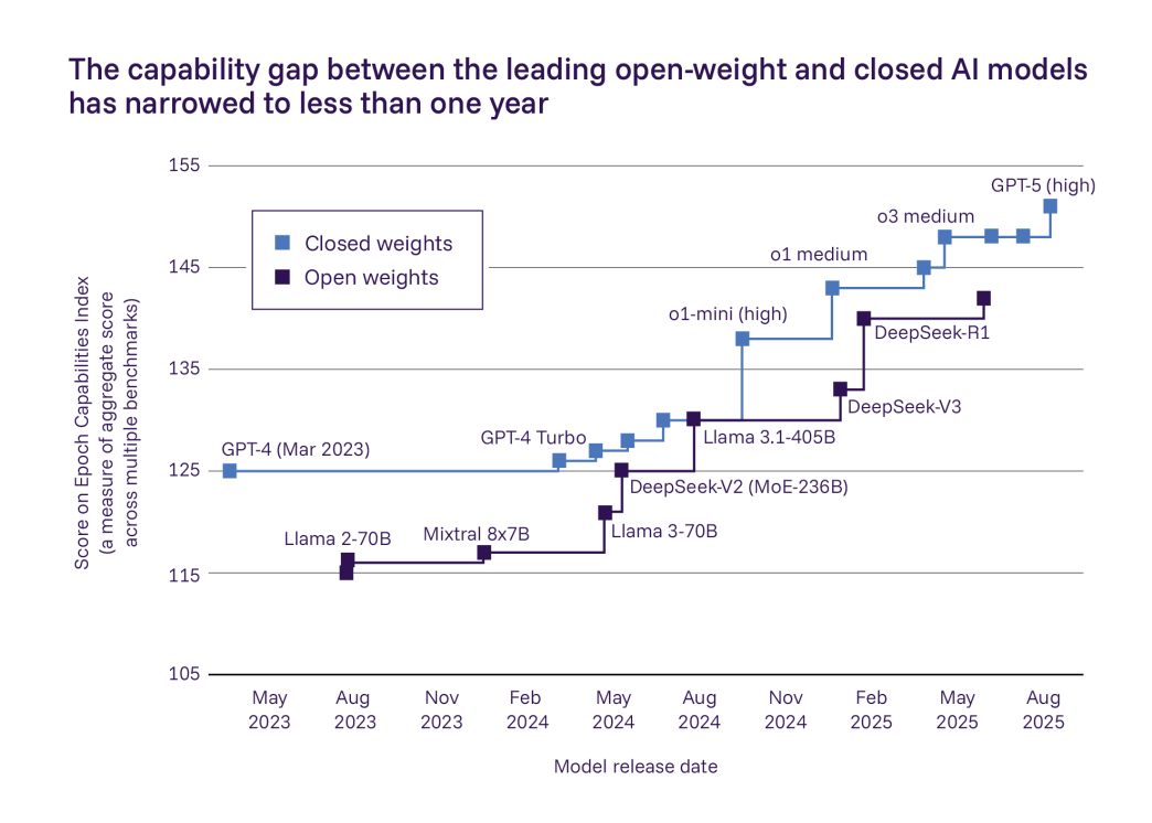 The gap between open-weight models (free ones anyone can download, like DeepSeek) and closed models (like GPT-4) has shrunk to less than one year, according to the Epoch Capabilities Index. Chinese developers DeepSeek and Alibaba released open-weight models that performed almost as well as leading closed ones, while OpenAI released its first open-weight models since 2019.